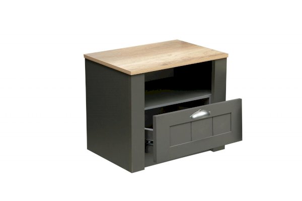 Небольшая тумбочка рядом с кроватью просто необходима! Открытая полка-ниша и выдвижной ящик – этого вполне хватает для размещения личных вещей. Нижний закрытый ящик плавно выдвигается вперед за счет шариковых направляющих.