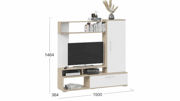 Кроме внешнего вида «Сиена» представляет собой единый набор, имеющий в составе всё необходимое для установки и использования в гостиной. Открытые полки, для размещения книг и предметов декора, открытая и закрытая ниши под ТВ позволят хранить медийную технику и личные вещи. Продуманный дизайн, практичная фурнитура, легкость и вместительность, всем этим может похвастаться малогабаритная гостиная «Сиена».