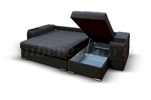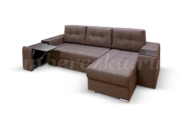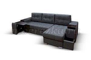 Угловой диван со столиком и выдвижными ящиками в подлокотниках «РИФ» завоевал среди покупателей большую популярность. Такая мебель значительно экономит пространство в помещении и, несомненно, делает отдых на диване комфортнее, ведь буквально под рукой есть раскладной столик в подлокотнике, на который можно поставить бокал, положить книгу или журнал, удобен при работе с ноутбуком. Другой подлокотник оборудован выдвижными полочками для хранения различных вещей. Большой ящик для белья внутри дивана, простой, и надежный механизм трансформации «тик-так» подтверждают функциональность этой модели. Блок независимых пружин, прошивка на сиденье – гарантия длительной эксплуатации дивана.