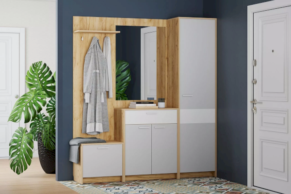 Тумба для обуви из коллекции НОРТОН выполнена в светлых оттенках, что визуально расширяет комнату, а контрастные тоны фасада придают помещению выразительность. Тумба представлена в двух цветах на выбор – Дуб Крафт Табачный и Дуб Крафт Золотой.